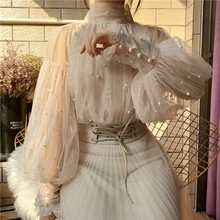 Autumn Beading Mesh Blouse Women Sweet Lantern Sleeve Pearls Gauze Blouses Ladies Elegant Shirt Tops Stand Collar Chiffon Y576 Blouses